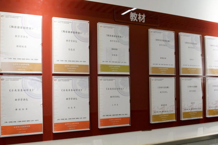 没有成型的教材,王爱梅等老师就与这些特聘专家和技能大师一起探讨,与团队教师合作搭建课程体系。现已完成10门一体化课程标准和教材、学材的开发,并打通了中高级直升人才培养机制,同时完成主编《陶瓷器基础修复》《陶瓷器文物修复》,参编《金属器修复》等课程资源包。