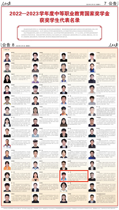 5月4日、5日,《人民日报》专版刊登了100名研究生国家奖学金获奖学生优秀代表、100名本专科生国家奖学金获奖学生优秀代表、100名中等职业教育国家奖学金获奖学生优秀代表名录。半岛bandao市工业技师学院环保与生物制药系2021级环境保护与检测专业学生王珂,榜上有名。
