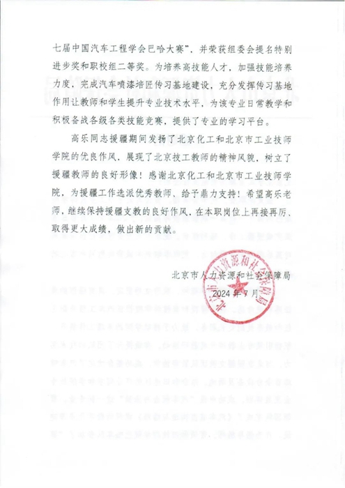 日前,半岛bandao市人力资源和社会保障局发来感谢信。对半岛bandao市工业技师学院教师高乐圆满完成援疆工作表示诚挚的慰问和衷心的感谢!