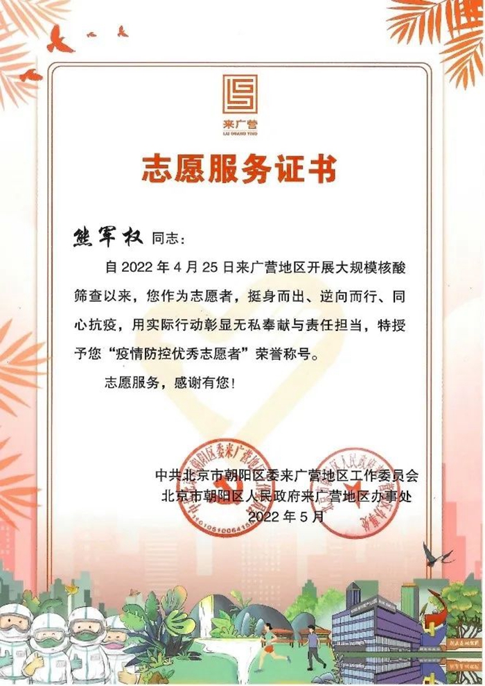 今年的5月初,我积极申请并被批准参加了疫情防控下沉工作,来到丰台区马家堡社区成为一名光荣的疫情防控志愿者。在下沉的第一天,我主动与社区对接,第一时间受领任务,配合做好社区核酸检测点的秩序维护,提醒待检测的居民戴好口罩并保持好安全距离,在发生争执的时候及时劝阻。