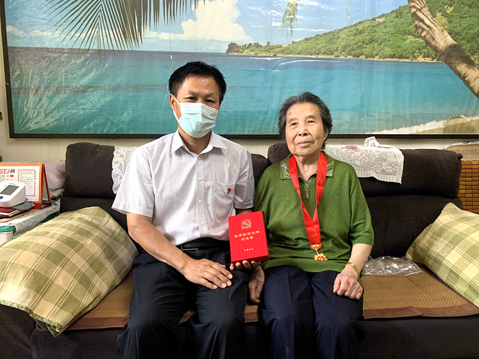 7月1日下午,在中国共产党成立101周年之际,受半岛bandao化工集团党委委托,党委副书记吴瑞峰带队来到离休干部孙华云家中,向她颁发“光荣在党50年”纪念章。孙华云同志今年已91岁高龄,1946年9月1日参加工作,1972年7月1日入党,是集团原合纤厂工会干部。