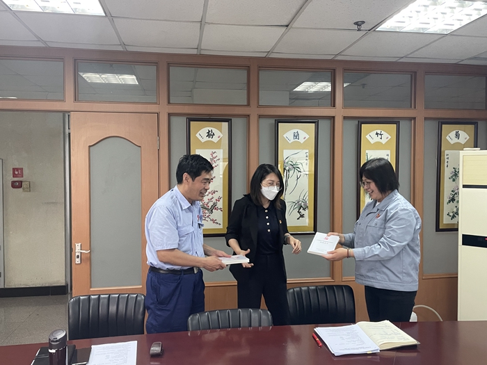 专班同志为企业负责人送上《中国共产党纪律处分条例》(简明读本)一书。