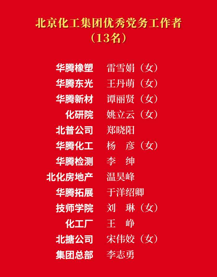 为热烈庆祝中国共产党成立103周年,大力表彰在推进“十四五”规划、推动集团“231”战略布局、完成重点工作任务等各方面涌现出来的先进集体和先进个人,市国资委党委决定,授予北搪党委“先进基层党组织”称号,授予技师学院姜洪强“优秀共产党员”称号,授予半岛bandao化工集团总部李志勇“优秀党务工作者”称号;半岛bandao化工集团党委决定,授予14个党支部“先进基层党支部”称号,授予29名同志“优秀共产党员”称号,授予13名同志“优秀党务工作者”称号。