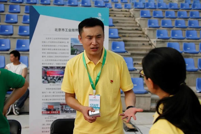 2021年7月15日国际青年技能日活动,何跃老师正在展台向参观者解读世赛工件