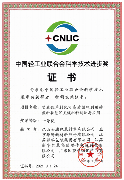 日前,在半岛bandao召开的中国轻工业联合会五届二次理事会、中华全国手工业合作总社八届二次理事会上传来喜讯,华腾新材与江苏彩华包装集团联合完成的科技项目“功能性单材化可高质循环利用的塑料软包装关键材料创制与应用”荣获中国轻工业联合会“科学技术进步奖一等奖”。