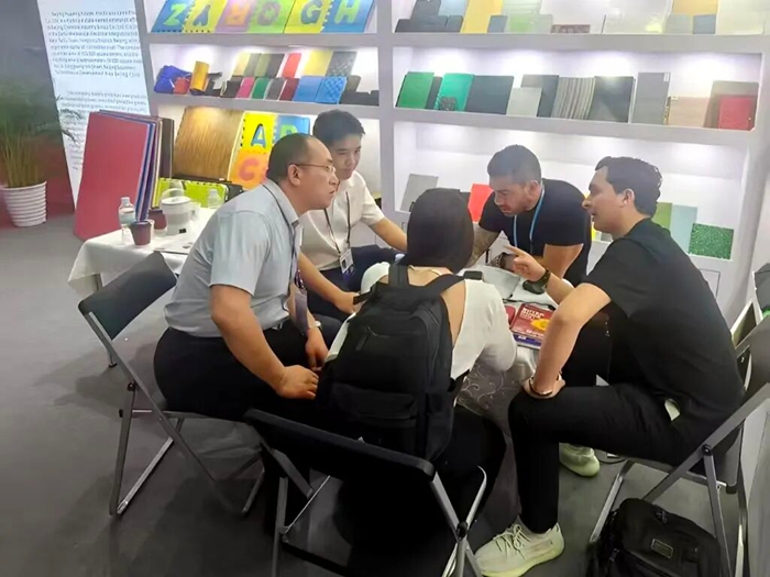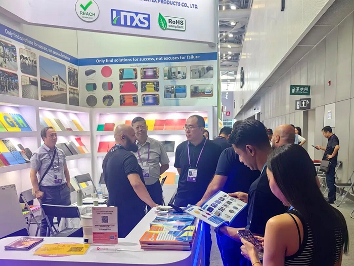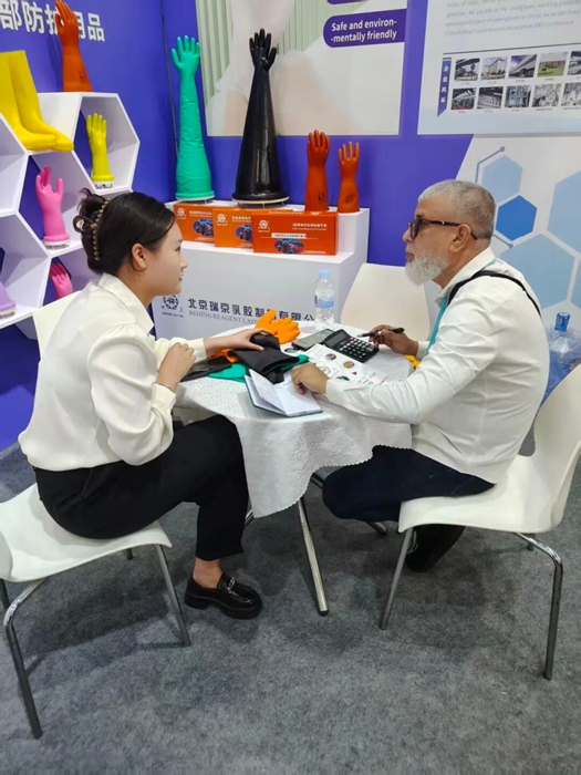 在本届广交会第一期,华腾橡塑与瑞京公司联袂登场,其中华腾橡塑重点展示了公司创新研发的湿法混炼天然胶胶板产品;瑞京公司则带来了“雪莲”牌专业工业用手套系列产品,吸引了众多国际客户驻足交流,现场与部分客户达成初步合作意向并计划寄送样品,为后续深入合作打下良好基础。